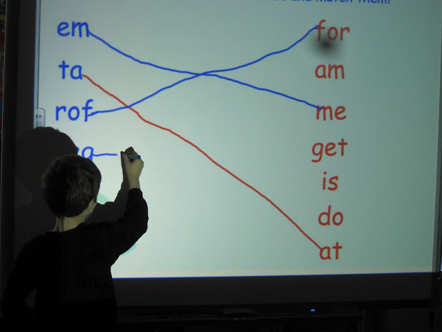 The students had a great time today, using our SMART Board. The SMART Board is an interactive white board that allows students to participate in hands-on learning through technology. Throughout the year, we will be using the SMART Board for all our different subjects. Today, we practiced reading, writing and matching our WOW words, and had fun with some rhyming activities. Tomorrow, we will be using the Smart Board during Visual Arts. Here are some students in action.